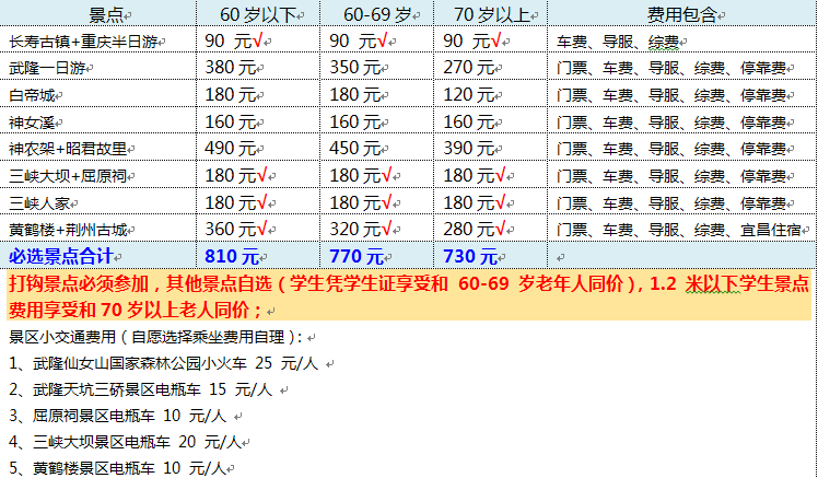 必選景點(diǎn)  長壽古鎮(zhèn)+重慶半日游、三峽大壩+屈原祠、三峽人家、黃鶴樓+荊州古城 60歲以下+810元;60-69歲+770元;70歲以上+730元
