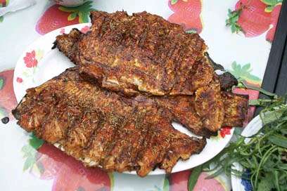 熱菜:烤紅鱒、排骨豆角面筋、鍋?zhàn)兴岵税兹狻⑿◆~燉豆腐、肉片芹菜、土豆燒茄子、絲瓜雞蛋、炸花椒芽