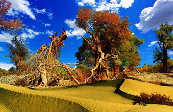 01  南疆胡楊  中國90%的原始胡楊在新疆南疆。輪臺塔里木河畔的胡楊林公園10月-11月上旬,色彩濃郁,一片金黃