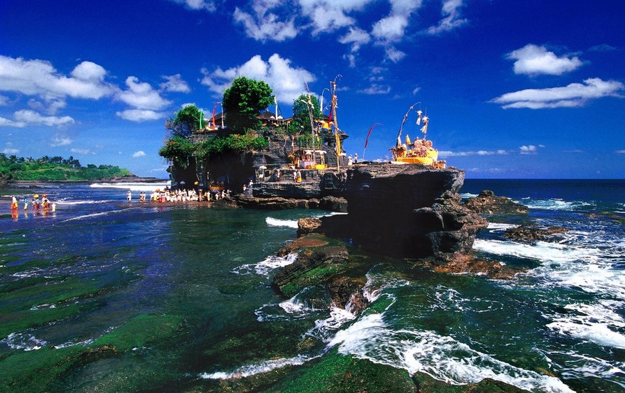 前往巴厘島**著名的【海神廟】(車程約70分鐘,游玩約60分鐘)蓋在海邊的一塊巨巖上是巴厘島——**著名的寺廟之一;該建筑是巴厘島居民的宗教崇拜的圣地,每當漲潮時海水會淹沒巖礁,巖石被海水包圍,整座寺廟與陸地隔絕,孤零零地矗立在海水中;只在落潮時才與陸地相連。