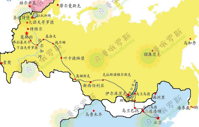 行程線路  北京--二連浩特--烏蘭巴托--納烏什金--烏蘭烏德--貝加爾湖--伊爾庫茨克--克拉斯諾亞爾斯克--新西伯利亞--奧木斯克--秋明--葉卡捷琳堡--喀山--圣彼得堡--莫斯科