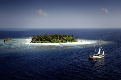 島嶼位于馬爾代夫北阿里環(huán)礁,從馬累乘坐水上飛機25分鐘即可到達島上。