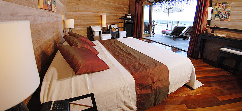 30棟豪華舒適的水上別墅,豎立在蘭色礁湖上。所有的別墅設(shè)計(jì)相同。家具設(shè)計(jì)獨(dú)特,經(jīng)過亞光處理的木制地板,超大尺寸的大床,或者雙人床??照{(diào),吊扇,起居區(qū)域帶有CD立體聲系統(tǒng)和儲(chǔ)備充足的迷你酒吧,意式咖啡機(jī)。國際長途電話和保險(xiǎn)箱。水上別墅的寬敞,奢華的成套浴室,偷過落地玻璃拉門可以看見整個(gè)海景。室外私人的甲板,每個(gè)陽臺的設(shè)計(jì)都能確保完全的私密性。每間水上別墅都可以直接從陽臺走到海里,在樓梯上還有淡水淋浴。
