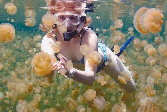 (2)在大斷層浮潛歸來之后,在長沙灘島上享用美味的BBQ午餐,退潮時海中央會露出綿延2公里細長的潔白沙灘,海洋猶如被分割兩半,是拍照的絕佳取景點哦!愛美愛拍照您前往不能錯過!離開長沙灘后乘快艇前往世界公認的七大奇觀之首的【水母湖】,翻過一座小山便能抵達,二戰(zhàn)時美軍偵察機飛過此地,發(fā)現(xiàn)湖面金光閃閃,以為是山中的寶藏,結(jié)果發(fā)現(xiàn)是由于湖中成千上萬的黃金水母在中午時分浮上水面進行光合作用。這些水母常年不受到外界天敵的威脅而退化到無毒。當你置身于成千上萬、大大小小、粉橘透明、軟軟Q彈的水母群之中,那感覺難以言喻的美妙,是前所未有的奇妙體驗!