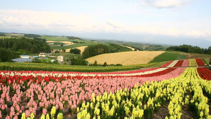 【富田農場】(約40分鐘)富田農場為北海道*先驅的花田之一。原僅栽種熏衣草的富田農場在主人的精心打理下漸漸地成為今日所見的彩虹花海。熏衣草以外,來到這里您還可以看到法國金盞花,罌粟花,羽扁豆花等多種花朵競艷,景觀讓人難忘。