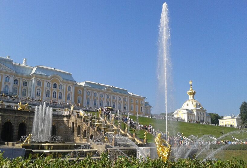 夏宮花園 俄羅斯夏宮又稱彼得宮,坐落在芬蘭灣南岸的森林中,它始建于1714年,分為上花園和下花園,大宮殿(宮殿外觀)在上花園。這里的建筑豪華壯麗,被譽(yù)為“俄羅斯的凡爾賽”。 大宮殿前是被稱作大瀑布的噴泉群。這里有37座金色雕像,29座潛浮雕,150個(gè)小雕像,64個(gè)噴泉及兩座梯形瀑布。在噴泉群一個(gè)大半圓形水池的中央,聳立著大力士參孫和獅子搏斗的雕像,這就是著名的隆姆松噴泉。