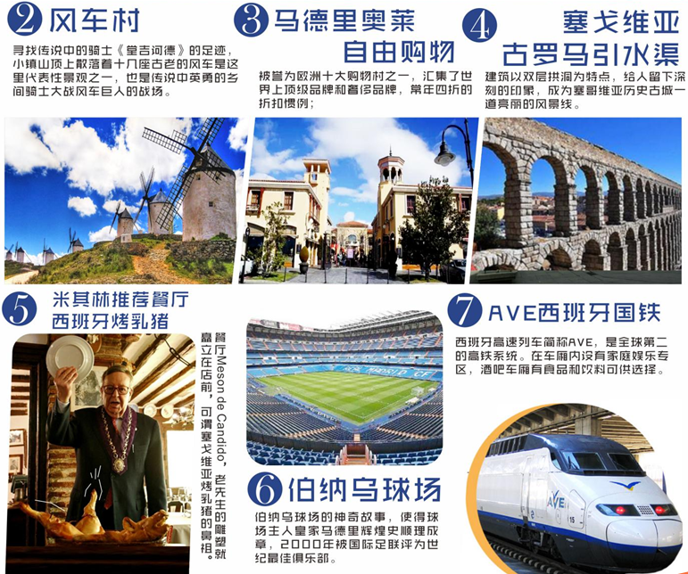 ?婚禮之城--葡萄牙奧比多斯;安達盧西亞白色山城--米哈斯;唐吉歌德足跡--西班牙風(fēng)車村;皇家馬德里俱樂部--伯納烏球場;