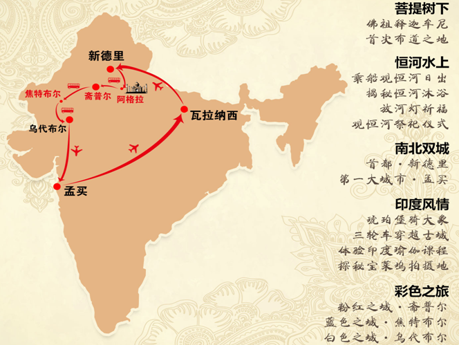 搭乘中國(guó)國(guó)際航空公司直飛航班往返印度,特別安排境內(nèi)航班,免去旅途勞累,全程5星酒店
