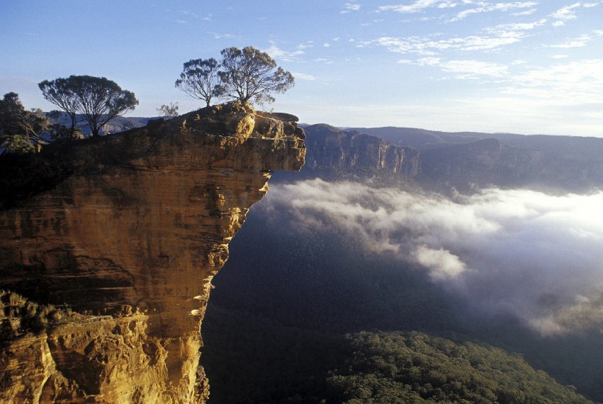 【藍山國家公園】:座落在新南威爾士州境內(nèi),距離悉尼市區(qū)約100公里,海拔1000 – 1200公尺。藍山全地區(qū)生長著龐大的原始森林和亞熱帶雨林,里面有90種不同品種的尤加利樹及超過400種的動物種類。藍山總是被一層淡藍色遮蔽,顯得異常美麗,亦透著神秘,藍山也因此得名。