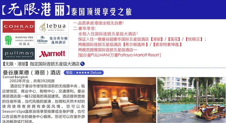 甄選泰航直飛曼谷,全程無(wú)自費(fèi),入住1晚超奢華曼谷【港麗/悅榕莊/蓮花】+2晚芭堤雅國(guó)際5星【鉑爾曼PULLMAN/萬(wàn)豪】+3晚曼谷國(guó)際5星【希爾頓逸林/索菲特素坤逸】,搭乘五星泰航或國(guó)航直飛曼谷