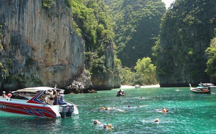 我們搭乘快艇前往【甲米四島】《雞島Chicken Island》、《管子島Tube Island》《莫島Moh Island》《波達島Poda Island》一帶,因電影《割喉島》拍攝而聞名于世。海上島嶼詮釋石灰?guī)r地形,不同角度產(chǎn)生不同的景物,更是奇特迷人。特別是雞島,因為島嶼形狀就像一只雄雞對著外海,所以被命名為雞島。雞島**出名的不僅是形狀有趣,島嶼另一端跟著海水漲退潮出現(xiàn)的一線沙灘。一線沙灘是甲米著名的自然景觀之一。如遇到漲潮,海水可高過一個人身高,必須靠船接駁才行。這似續(xù)似斷的沙灘,被當?shù)厝朔Q為「Talay Wet」泰文為分開之意。這特殊景象不僅吸引大批觀光客前來,也是電影《割喉島》女主角騎馬破浪而出的景象。結(jié)束了四島行程,我們搭乘快艇前往PP島,大PP島上中餐,下午后搭乘快艇前往【大PP環(huán)島】此島被泰國政府規(guī)劃為國家公園,環(huán)境受到重視,也是歐美旅客**向往之離島渡假勝地!我們搭乘快艇前往一片三面環(huán)山擁有著細膩沙灘的幽靜海域—【情人沙灘】,作為電影《沙灘》的外景拍攝地而名聲大振。島上100來米的沙灘擁有全普吉**細白的沙粒,又細又白的沙粒像極了胡椒面。 您可以游泳、日光浴更可以靜靜去享受情人沙灘的柔美。在大家盡興后我們搭乘快艇(快艇會經(jīng)過泰國金絲海燕洞,因為是政府保護開采所以我們只能遠觀),后來到一片使人激動人心的海域【小PP島環(huán)游】您更可以馬上穿上救生衣、帶上我們?yōu)槟鷾蕚涞膶I(yè)蛙鏡掉入海中與熱帶魚共舞,此刻的場景,仿佛您跳入了魚塘中. 之后特別安排之后返回酒店休息此晚入住PP島。