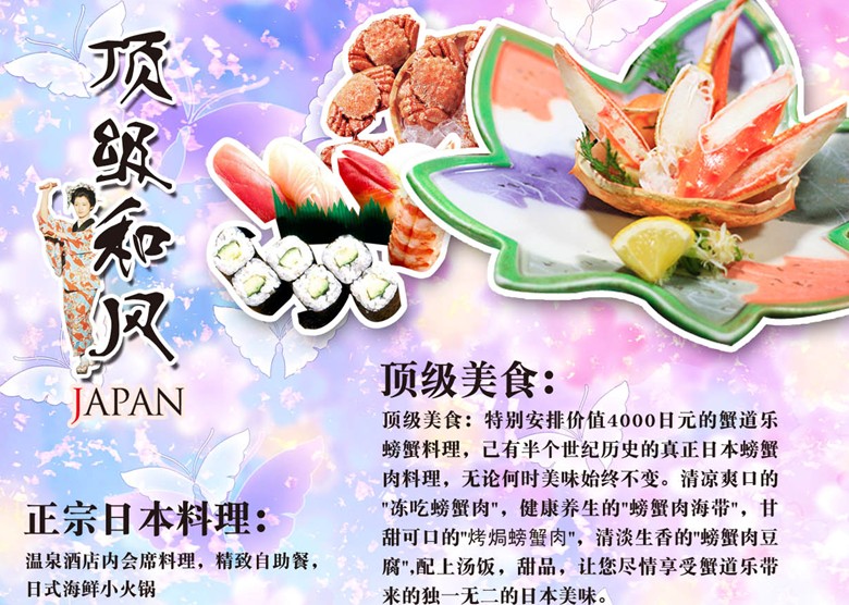 ☆用餐:日本料理與中餐相比,比較清淡簡單,中國團隊在日本用餐可能會有不習(xí)慣之處。請各位團友有心里準(zhǔn)備,此經(jīng)歷也是對日本習(xí)俗的一個了解。旅程中有時會遇上塞車,**好自備一些零食,以便饑餓時有東西吃。
