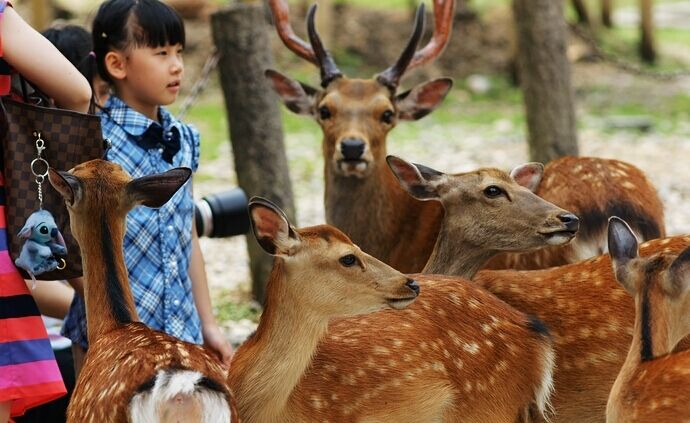 【奈良神鹿公園】(約30分鐘)位于奈良市街的東邊,公園面積廣闊,若草山、東大寺、春日大社、國(guó)立博物館等奈良的名勝古跡大多在這里。奈良公園最引人注目的是梅花鹿,其中有1200頭鹿生活在這里,這些鹿大多溫順而討人喜愛(ài)。每年10月,會(huì)舉行傳統(tǒng)活動(dòng)“割鹿角”。