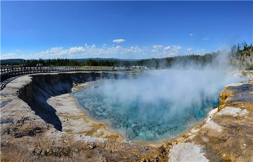 在黃石公園內(nèi)的第一站,我們將先來到諾里斯景區(qū)(Norris 約30分鐘),這里是黃石公園泉水最熱、最活躍、最多變的地區(qū)之一。清晨涼爽的空氣拂面,讓人為之精神振奮。晨霧與地熱構(gòu)成一幅氤氳的水霧畫,遠遠近近的薄霧圍繞身邊,五彩光暈幻化其中,一路走來幾乎不會有什么人,很有些走入仙境的感覺。接著前往黃石公園內(nèi)最精華的部分【峽谷區(qū)】Canyon Country)(約1小時),【黃石峽谷】(Yellowstone Canyon)與【黃石瀑布】(Yellowstone Falls)。在峽谷內(nèi)健行,眼前的黃石河陡然變急,沖開四濺的水花,形成兩道壯麗的瀑布,轟鳴著泄入峽谷。兩道瀑布沖刷著峽谷巖石,可如油彩般的色彩不會被沖刷褪色,反而在朝霞下更見鮮艷。峽谷區(qū)【Artist Point瞭望臺】,風景優(yōu)美的瞭望臺和交織的黃石峽谷邊緣山路成為峽谷區(qū)(Canyon Country)的主要亮點。離開峽谷區(qū),去觀賞的【泥火山】(Mud Volcano)(約20分鐘),又是另一番景象,平靜時如一潭死水,噴發(fā)時則泥漿涌動,酸霧密布。這里是黃石硫磺濃度最高的區(qū)域,噴發(fā)的洞窟旁邊,形成了一個個硫酸湖,湖邊結(jié)著許多黃色的硫磺結(jié)晶。游覽【豆?jié){池】(Fountain Paint Pot)(約20分鐘),以及依顏色和水溫而排列的【氣孔噴泉】(A Fumarole)(約15分鐘),接著我們將去到【中途景區(qū)】(Midway)(約30分鐘),游覽【大棱鏡泉】Grand Prismatic Spring)是黃石公園的標志性景點,也是眾多彩池中最大的一個。開闊的水面因不同的溫度和菌種,形成極其恣意艷麗的顏色,仿佛是上帝的調(diào)色盤一般。而【火洞河】(Firehole River)則呈現(xiàn)出黃黑的顏色,是因為它的河水中含有大量硫物質(zhì)。最后前往最有名的是老忠實泉間歇泉Old Faithful)(約1小時),間歇泉區(qū)最好的表現(xiàn)了公園的地熱特征,分為上間歇泉盆地、中間歇泉盆地、下間歇泉盆地。